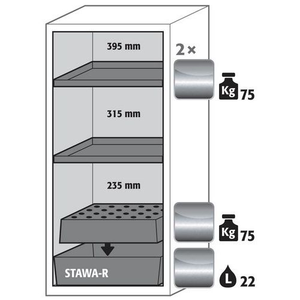 Veilige opslag, voldoet aan de geldende regelgeving voor gevaarlijke, ontvlambare producten in werkruimtes Robuust en duurzaam: Stevige constructie aan de buitenzijde van brandwerende platen met een coating van melaminehars 3 bevestigingsscharnieren per deur volledig sluitmechanisme en beveiligingselementen ter bescherming tegen corrosie, gemonteerd buiten de opslagruimte hoogwaardige deur, krasbestendig, met gestructureerd oppervlak met epoxy-coating Ergonomisch: de deur blijft in de stand staan bij het openen, automatische sluiting in geval van brand Gecontroleerd gebruik: vergrendelbare deur, compatibel met centrale vergrendeling Eenvoudig transport: geïntegreerde transportsokkel, eenvoudig afgewerkte plint of plint met 4 nivelleringsvoeten optioneel beschikbaar Beluchting en ontluchting: ingebouwd beluchtings- en ventilatiesysteem voor aansluiting (diameter 75 mm) op een technisch luchtafvoersysteem Getest en gecertificeerd conform de Amerikaanse norm FM 6050