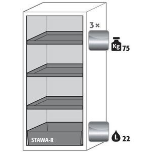 Veilige opslag, voldoet aan de geldende regelgeving voor gevaarlijke, ontvlambare producten in werkruimtes Robuust en duurzaam: Stevige constructie aan de buitenzijde van brandwerende platen met een coating van melaminehars 3 bevestigingsscharnieren per deur volledig sluitmechanisme en beveiligingselementen ter bescherming tegen corrosie, gemonteerd buiten de opslagruimte hoogwaardige deur, krasbestendig, met gestructureerd oppervlak met epoxy-coating Ergonomisch: de deur blijft in de stand staan bij het openen, automatische sluiting in geval van brand Gecontroleerd gebruik: vergrendelbare deur, compatibel met centrale vergrendeling Eenvoudig transport: geïntegreerde transportsokkel, eenvoudig afgewerkte plint of plint met 4 nivelleringsvoeten optioneel beschikbaar Beluchting en ontluchting: ingebouwd beluchtings- en ventilatiesysteem voor aansluiting (diameter 75 mm) op een technisch luchtafvoersysteem Getest en gecertificeerd conform de Amerikaanse norm FM 6050