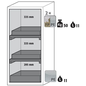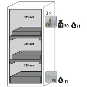 Veilige opslag, voldoet aan de geldende regelgeving voor gevaarlijke, ontvlambare producten in werkruimtes Robuust en duurzaam: Stevige constructie aan de buitenzijde van brandwerende platen met een coating van melaminehars 3 bevestigingsscharnieren per deur volledig sluitmechanisme en beveiligingselementen ter bescherming tegen corrosie, gemonteerd buiten de opslagruimte hoogwaardige deur, krasbestendig, met gestructureerd oppervlak met epoxy-coating Ergonomisch: de deur blijft in de stand staan bij het openen, automatische sluiting in geval van brand Gecontroleerd gebruik: vergrendelbare deur, compatibel met centrale vergrendeling Eenvoudig transport: geïntegreerde transportsokkel, eenvoudig afgewerkte plint of plint met 4 nivelleringsvoeten optioneel beschikbaar Beluchting en ontluchting: ingebouwd beluchtings- en ventilatiesysteem voor aansluiting (diameter 75 mm) op een technisch luchtafvoersysteem Getest en gecertificeerd conform de Amerikaanse norm FM 6050