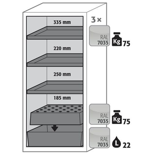 Veilige opslag, voldoet aan de geldende regelgeving voor gevaarlijke, ontvlambare producten in werkruimtes Robuust en duurzaam: Stevige constructie aan de buitenzijde van brandwerende platen met een coating van melaminehars 3 bevestigingsscharnieren per deur volledig sluitmechanisme en beveiligingselementen ter bescherming tegen corrosie, gemonteerd buiten de opslagruimte hoogwaardige deur, krasbestendig, met gestructureerd oppervlak met epoxy-coating Ergonomisch: de deur blijft in de stand staan bij het openen, automatische sluiting in geval van brand Gecontroleerd gebruik: vergrendelbare deur, compatibel met centrale vergrendeling Eenvoudig transport: geïntegreerde transportsokkel, eenvoudig afgewerkte plint of plint met 4 nivelleringsvoeten optioneel beschikbaar Beluchting en ontluchting: ingebouwd beluchtings- en ventilatiesysteem voor aansluiting (diameter 75 mm) op een technisch luchtafvoersysteem Getest en gecertificeerd conform de Amerikaanse norm FM 6050