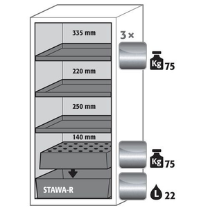 Veilige opslag, voldoet aan de geldende regelgeving voor gevaarlijke, ontvlambare producten in werkruimtes Functie/constructie: Robuust en duurzaam: stevige stalen constructie aan de buitenkant met epoxy-coating 3 bevestigingsscharnieren per deur, volledig sluitmechanisme en beveiligingselementen ter bescherming tegen corrosie, gemonteerd buiten de opslagruimte Comfortabel: automatisch deursluitsysteem, deuren kunnen in geopende stand worden gehouden. Veilige opslag van containers Altijd gesloten: automatisch deursluitsysteem (TSA) sluit de geblokkeerde deur na 60 seconde, geluidsalarm en visueel alarm voordat de deur sluit Gecontroleerd gebruik: vergrendelbare deur, compatibel met centrale vergrendeling Eenvoudige installatie: geïntegreerde verstelbare poten Beluchting en ontluchting: ingebouwd beluchtings- en ventilatiesysteem voor aansluiting (diameter 75 mm) op een technisch luchtafvoersysteem Let op: voor de technische ventilatie van de kast adviseren wij de ventilatiebox met geïntegreerde filtratie (zonder gaten in de muren te boren of afvoerleidingen naar buiten).