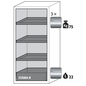 Veilige opslag, voldoet aan de geldende regelgeving voor gevaarlijke, ontvlambare producten in werkruimtes Functie/constructie: Robuust en duurzaam: stevige stalen constructie aan de buitenkant met epoxy-coating 3 bevestigingsscharnieren per deur, volledig sluitmechanisme en beveiligingselementen ter bescherming tegen corrosie, gemonteerd buiten de opslagruimte Comfortabel: automatisch deursluitsysteem, deuren kunnen in geopende stand worden gehouden. Veilige opslag van containers Altijd gesloten: automatisch deursluitsysteem (TSA) sluit de geblokkeerde deur na 60 seconde, geluidsalarm en visueel alarm voordat de deur sluit Gecontroleerd gebruik: vergrendelbare deur, compatibel met centrale vergrendeling Eenvoudige installatie: geïntegreerde verstelbare poten Beluchting en ontluchting: ingebouwd beluchtings- en ventilatiesysteem voor aansluiting (diameter 75 mm) op een technisch luchtafvoersysteem Let op: voor de technische ventilatie van de kast adviseren wij de ventilatiebox met geïntegreerde filtratie (zonder gaten in de muren te boren of afvoerleidingen naar buiten).