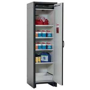 Veilige opslag, voldoet aan de geldende regelgeving voor gevaarlijke, ontvlambare producten in werkruimtes Robuust en duurzaam: stevige constructie aan de buitenzijde van brandwerende platen met een coating van melaminehars 3 bevestigingsscharnieren per deur, volledig sluitmechanisme en beveiligingselementen ter bescherming tegen corrosie, gemonteerd buiten de opslagruimte hoogwaardige deur, krasbestendig, met gestructureerd oppervlak met epoxy-coating Ergonomisch: de deur blijft in de stand staan bij het openen, automatische sluiting in geval van brand Gecontroleerd gebruik: vergrendelbare deur, compatibel met centrale vergrendeling Eenvoudig transport: geïntegreerde transportsokkel, eenvoudig afgewerkte plint of plint met 4 nivelleringsvoeten optioneel beschikbaar Beluchting en ontluchting: ingebouwd beluchtings- en ventilatiesysteem voor aansluiting (diameter 75 mm) op een technisch luchtafvoersysteem Getest en gecertificeerd conform de Amerikaanse norm FM 6050 Let op: wij raden aan om naast de kast ook de plint met verstelinrichting te bestellen. Hierdoor is het mogelijk om snel en veilig kleine oneffenheden in de vloer op te vangen, zodat de kast eenvoudig en zonder veel moeite kan worden versteld. Voor de technische ventilatie van de kast adviseren wij de ventilatiebox met geïntegreerde filtratie (zonder gaten in de muren te boren of afvoerleidingen naar buiten).
