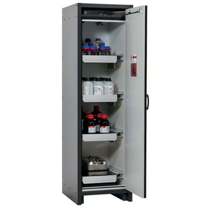 Veilige opslag, voldoet aan de geldende regelgeving voor gevaarlijke, ontvlambare producten in werkruimtes Robuust en duurzaam: stevige constructie aan de buitenzijde van brandwerende platen met een coating van melaminehars 3 bevestigingsscharnieren per deur, volledig sluitmechanisme en beveiligingselementen ter bescherming tegen corrosie, gemonteerd buiten de opslagruimte hoogwaardige deur, krasbestendig, met gestructureerd oppervlak met epoxy-coating Ergonomisch: de deur blijft in de stand staan bij het openen, automatische sluiting in geval van brand Gecontroleerd gebruik: vergrendelbare deur, compatibel met centrale vergrendeling Eenvoudig transport: geïntegreerde transportsokkel, eenvoudig afgewerkte plint of plint met 4 nivelleringsvoeten optioneel beschikbaar Beluchting en ontluchting: ingebouwd beluchtings- en ventilatiesysteem voor aansluiting (diameter 75 mm) op een technisch luchtafvoersysteem Getest en gecertificeerd conform de Amerikaanse norm FM 6050 Let op: wij raden aan om naast de kast ook de plint met verstelinrichting te bestellen. Hierdoor is het mogelijk om snel en veilig kleine oneffenheden in de vloer op te vangen, zodat de kast eenvoudig en zonder veel moeite kan worden versteld. Voor de technische ventilatie van de kast adviseren wij de ventilatiebox met geïntegreerde filtratie (zonder gaten in de muren te boren of afvoerleidingen naar buiten).