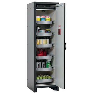 Veilige opslag, voldoet aan de geldende regelgeving voor gevaarlijke, ontvlambare producten in werkruimtes Robuust en duurzaam: stevige stalen constructie aan de buitenzijde van brandwerende platen bekleed met melaminehars 3 bevestigingingsscharnieren per deur volledig sluitmechanisme en beveiligingselementen ter bescherming tegen corrosie, gemonteerd buiten de opslagruimte hoogwaardige deur, krasbestendig, met gestructureerd oppervlak met epoxy-coating Ergonomisch: de deur blijft in de stand staan bij het openen, automatische sluiting in geval van brand Gecontroleerd gebruik: vergrendelbare deur, compatibel met centrale vergrendeling Eenvoudig transport: geïntegreerde transportsokkel, eenvoudig afgewerkte plint of plint met 4 nivelleringsvoeten optioneel beschikbaar Beluchting/ontluchting: geïntegreerd beluchtings- en ventilatiesysteem voor aansluiting (diameter 75 mm) op een technisch luchtafvoersysteem Getest en gecertificeerd conform de Amerikaanse norm FM 6050 Let op: wij raden aan om naast de kast ook de plint met verstelinrichting te bestellen. Hierdoor is het mogelijk om snel en veilig kleine oneffenheden in de vloer op te vangen, zodat de kast eenvoudig en zonder veel moeite kan worden versteld. Voor de technische ventilatie van de kast adviseren wij de ventilatiebox met geïntegreerde filtratie (zonder gaten in de muren te boren of afvoerleidingen naar buiten).