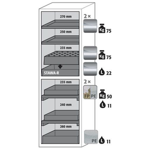 Veilige opslag van ontvlambare gevaarlijke stoffen in werkruimtes conform de wettelijke voorschriften, Functie - constructie: Robuust en duurzaam: stabiele buitenbehuizing van gepoedercoat fijn plaatstaal, 3-voudige deurophanging, volledig sluitmechaniek en veiligheidselementen ter bescherming tegen corrosie buiten de opslagruimte gemonteerd, Ruimtebesparende vouwdeur: kleine benodigde ruimte voor de kast bij geopende deur, Betrouwbaar en veilig: de deur klikt vast in de standaard gemonteerde deurvastzetinrichting voor het veilig plaatsen en uitnemen van emballage, Geen toegang voor onbevoegden: deur afsluitbaar met profielcilinder (geschikt voor centraal deursluitsysteem), Gemakkelijk te plaatsen: stelvoeten voor het compenseren van kleinere oneffenheden in de vloer (tot 10 mm), Be- en ontluchting: geïntegreerd beluchtings- en ventilatiesysteem voor aansluiting (NW 75) op een mechanische afzuiginstallatie Let op: voor de technische ventilatie van de kast adviseren wij de ventilatiebox met geïntegreerde filtratie (zonder gaten in de muren te boren of afvoerleidingen naar buiten).