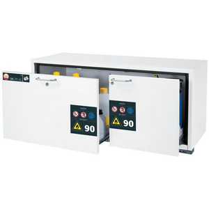 Veiligheidsonderbouwkast UB-S-90 UB90.060.140.2S_Asecos, Totale hoogte: 600 mm, Totale breedte: 1402 mm, Totale hoogte (Reeks): Laag of onder laboratoriumtafel (600 - 800 mm), Totale breedte (Reeks): 800 mm, Aantal legborden: 0, Voor producten: Ontvlambare stoffen, Brandveilig: 90 min, Inhoud opvangbak: 0 L, Aantal vakken: 1, Model: 1x lade, 1x lade (plaatstaal met epoxy-coating), Aantal deuren: 2, Kleur ombouw: Wit, Kleur deur: Wit, Totale diepte: 574 mm, Nuttige breedte: 1279 mm, Nuttige diepte: 452 mm, Nuttige hoogte: 502 mm, Gewicht: 263.768 kg, RAL: 9016, Special Covid-19: nee