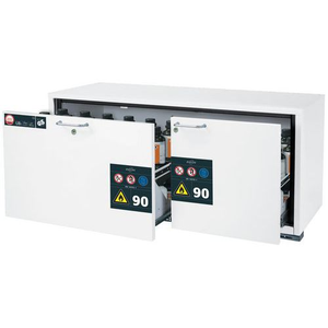Veiligheidsonderbouwkast UB-S-90 UB90.060.140.2S_Asecos, Totale hoogte: 600 mm, Totale breedte: 1402 mm, Totale hoogte (Reeks): Laag of onder laboratoriumtafel (600 - 800 mm), Totale breedte (Reeks): 800 mm, Aantal legborden: 0, Voor producten: Ontvlambare stoffen, Brandveilig: 90 min, Inhoud opvangbak: 0 L, Aantal vakken: 1, Model: 1x lade (plaatstaal met epoxy-coating), 1x rooster (roestvrij staal), 1x tweede niveau lade, 1x lade (plaatstaal met epoxy-coating), 1x rooster (roestvrij staal), 1x tweede niveau lade (plaatstaal met epoxy-coating), Aantal deuren: 2, Kleur ombouw: Wit, Kleur deur: Wit, Totale diepte: 574 mm, Nuttige breedte: 1279 mm, Nuttige diepte: 452 mm, Nuttige hoogte: 502 mm, Gewicht: 281.268 kg, RAL: 9016, Special Covid-19: nee