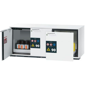 Veiligheidsonderbouwkast UB-ST-90_Asecos, Totale hoogte: 600 mm, Totale breedte: 1402 mm, Totale hoogte (Reeks): Laag of onder laboratoriumtafel (600 - 800 mm), Totale breedte (Reeks): 800 mm, Aantal legborden: 0, Voor producten: Ontvlambare stoffen, Brandveilig: 90 min, Inhoud opvangbak: 20 L, Aantal vakken: 1, Model: 1x rooster, 1x opvangbak op de vloer, 1x lade (plaatstaal met epoxy-coating), Aantal deuren: 3, Kleur ombouw: Wit, Kleur deur: Wit, Totale diepte: 574 mm, Nuttige breedte: 1279 mm, Nuttige diepte: 452 mm, Nuttige hoogte: 502 mm, Materiaal: Staal, Gewicht: 264.768 kg, RAL: 9016, Special Covid-19: nee