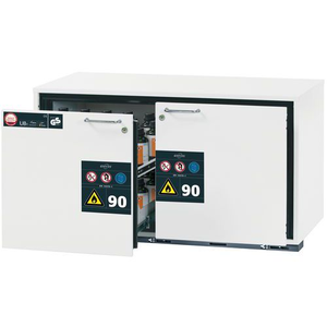 Veiligheidsonderbouwkast UB-S-90 UB90.060.110.2S_Asecos, Totale hoogte: 600 mm, Totale breedte: 1102 mm, Totale hoogte (Reeks): Laag of onder laboratoriumtafel (600 - 800 mm), Totale breedte (Reeks): 800 mm, Aantal legborden: 0, Voor producten: Ontvlambare stoffen, Brandveilig: 90 min, Inhoud opvangbak: 0 L, Aantal vakken: 1, Model: 2x lade (plaatstaal met epoxy-coating), 2x rooster (roestvrij staal), 2x tweede niveau lade (plaatstaal met epoxy-coating), Aantal deuren: 2, Kleur ombouw: Wit, Kleur deur: Wit, Totale diepte: 574 mm, Nuttige breedte: 979 mm, Nuttige diepte: 452 mm, Nuttige hoogte: 502 mm, Gewicht: 237.956 kg, RAL: 9016, Special Covid-19: nee