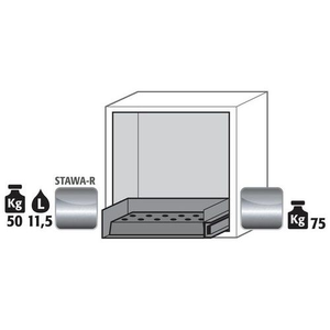 Veilige opslag, voldoet aan de geldende regelgeving voor gevaarlijke, ontvlambare producten in werkruimtes Robuust en duurzaam: Stevige constructie aan de buitenzijde van brandwerende platen met een coating van melaminehars 3 bevestigingsscharnieren per deur volledig sluitmechanisme en beveiligingselementen ter bescherming tegen corrosie, gemonteerd buiten de opslagruimte hoogwaardige deur, krasbestendig, met gestructureerd oppervlak met epoxy-coating Ergonomisch: de deur blijft in de stand staan bij het openen, automatische sluiting in geval van brand Gecontroleerd gebruik: vergrendelbare deur, compatibel met centrale vergrendeling Eenvoudig transport: geïntegreerde transportsokkel, eenvoudig afgewerkte plint of plint met 4 nivelleringsvoeten optioneel beschikbaar Beluchting en ontluchting: ingebouwd beluchtings- en ventilatiesysteem voor aansluiting (diameter 75 mm) op een technisch luchtafvoersysteem Getest en gecertificeerd conform de Amerikaanse norm FM 6050 Let op: wij raden aan om naast de kast ook de wielbasis (en geïntegreerde rem) te bestellen. Hierdoor is de kast gemakkelijk te verplaatsen voor optimale mobiliteit.