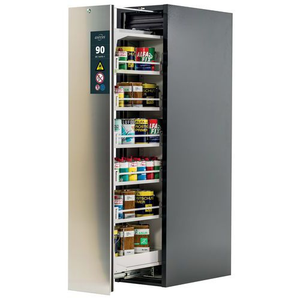 Veilige opslag, voldoet aan de geldende regelgeving voor gevaarlijke, ontvlambare producten in werkruimtes Robuuste constructie met lange levensduur: kast met stabiele behuizing van hoge kwaliteit en krasbestendig, met een oppervlak met epoxylak Elektronische opening en sluiting: de verticale laden kunnen worden geopend en gesloten met slechts één druk op de knop Perfecte toegang: de verticale laden bieden overzicht en eenvoudige toegang tot opgeslagen producten Altijd gesloten: standaard sluiting in serie na ongeveer 60 seconden met visueel en geluidsalarm dat aangeeft dat de lade sluit Onbevoegd gebruik is niet mogelijk: verticale vergrendelbare laden met cilinderslot (inbouw in een bestaand vergrendelingssysteem is mogelijk) en indicator voor de vergrendelingsstatus (rood/groen) Beluchting en ontluchting: ingebouwd beluchtings- en ventilatiesysteem voor aansluiting (diameter 75 mm) op een technisch luchtafvoersysteem Let op: voor de technische ventilatie van de kast adviseren wij de ventilatiebox met geïntegreerde filtratie (zonder gaten in de muren te boren of afvoerleidingen naar buiten).