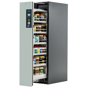 Veiligheidskast V-MOVE-90_Asecos, Totale hoogte: 1966 mm, Totale breedte: 449 mm, Totale hoogte (Reeks): Hoog (1500 - 2300 mm), Totale breedte (Reeks): 500 mm, Aantal legborden: 5, Voor producten: Ontvlambare stoffen, Brandveilig: 90 min, Inhoud opvangbak: 12.5 L, Aantal vakken: 1, Model: 5x opvanglegbord, 1x opvangbak op de vloer (plaatstaal met epoxy-coating), Aantal deuren: 1, Kleur ombouw: Antraciet, Kleur deur: Lichtgrijs, Totale diepte: 860 mm, Nuttige breedte: 331 mm, Nuttige diepte: 775 mm, Nuttige hoogte: 1750 mm, Materiaal: Staal, Gewicht: 401.74 kg, RAL: 7016, Special Covid-19: nee