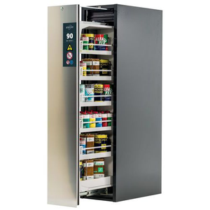 Veilige opslag, voldoet aan de geldende regelgeving voor gevaarlijke, ontvlambare producten in werkruimtes Robuuste constructie met lange levensduur: kast met stabiele behuizing van hoge kwaliteit en krasbestendig, met een oppervlak met epoxylak Elektronische opening en sluiting: de verticale laden kunnen worden geopend en gesloten met slechts één druk op de knop Perfecte toegang: de verticale laden bieden overzicht en eenvoudige toegang tot opgeslagen producten Altijd gesloten: standaard sluiting in serie na ongeveer 60 seconden met visueel en geluidsalarm dat aangeeft dat de lade sluit Onbevoegd gebruik is niet mogelijk: verticale vergrendelbare laden met cilinderslot (inbouw in een bestaand vergrendelingssysteem is mogelijk) en indicator voor de vergrendelingsstatus (rood/groen) Beluchting en ontluchting: ingebouwd beluchtings- en ventilatiesysteem voor aansluiting (diameter 75 mm) op een technisch luchtafvoersysteem