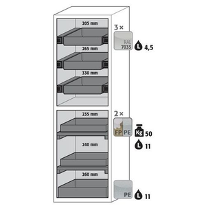 Veilige opslag, voldoet aan de geldende regelgeving voor gevaarlijke, ontvlambare producten in werkruimtes Robuust en duurzaam: Stevige constructie aan de buitenzijde van brandwerende platen met een coating van melaminehars 3 bevestigingsscharnieren per deur volledig sluitmechanisme en beveiligingselementen ter bescherming tegen corrosie, gemonteerd buiten de opslagruimte hoogwaardige deur, krasbestendig, met gestructureerd oppervlak met epoxy-coating Ergonomisch: de deur blijft in de stand staan bij het openen, automatische sluiting in geval van brand Gecontroleerd gebruik: vergrendelbare deur, compatibel met centrale vergrendeling Eenvoudig transport: geïntegreerde transportsokkel, eenvoudig afgewerkte plint of plint met 4 nivelleringsvoeten optioneel beschikbaar Beluchting en ontluchting: ingebouwd beluchtings- en ventilatiesysteem voor aansluiting (diameter 75 mm) op een technisch luchtafvoersysteem Getest en gecertificeerd conform de Amerikaanse norm FM 6050