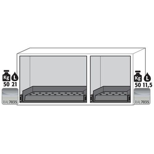 Veiligheidsonderbouwkast UB-S-90 UB90.060.140.UL.2S_Asecos, Totale hoogte: 600 mm, Totale breedte: 1402 mm, Totale hoogte (Reeks): Laag of onder laboratoriumtafel (600 - 800 mm), Totale breedte (Reeks): 800 mm, Aantal legborden: 0, Voor producten: Ontvlambare stoffen, Brandveilig: 90 min, Inhoud opvangbak: 0 L, Aantal vakken: 1, Model: 1x lade (plaatstaal met epoxy-coating), 1x rooster (roestvrij staal), 1x lade (plaatstaal met epoxy-coating), 1x rooster (roestvrij staal), Aantal deuren: 2, Kleur ombouw: Lichtgrijs, Kleur deur: Lichtgrijs, Totale diepte: 574 mm, Nuttige breedte: 1279 mm, Nuttige diepte: 452 mm, Nuttige hoogte: 502 mm, Gewicht: 247.000 kg, RAL: 7035, Special Covid-19: nee