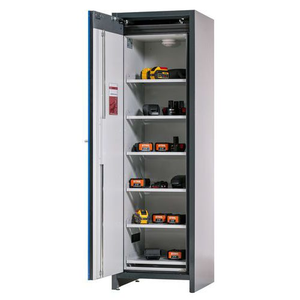 Kast voor lithiumionbatterijen Ion-Core-90 breedte 60, Materiaal: Staal, Totale hoogte: 1953 mm, Totale breedte: 599 mm, Voor producten: (Lithium)batterijen, Brandveilig: 90 min, Totale diepte: 615 mm, Aantal vakken: 6, Aantal deuren: 1, Aantal legborden: 6, Kleur ombouw: Antraciet, Max. belasting: 600 kg, Nuttige hoogte: 1647 mm, Nuttige breedte: 450 mm, Gewicht: 300.00 kg, Nuttige diepte: 522 mm, Deur openingstype: Klapdeur, Type sluiting: Met sleutel, RAL: 7016 5010, CE: ja