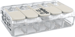 Wago 221 Compact lasklem, kleurloos, nom. doorsnede 0.2 - 4mm², geschikt voor soepele ader, met bedieningshendeltjes, 5 klemposities, nom. stroom 24.5A, aderdoorsnede massieve draad 0.2 - 4mm², aderdoorsnede soepel met huls 0.14 - 4mm², AWG-bereik 12 - 24, geschikt voor massieve ader,