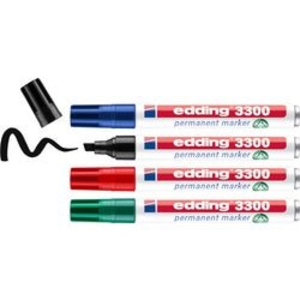 Edding permanent marker 3300. De klassieker met schuine punt. De sneldrogende, lichtbestendige, veegvaste en waterbestendige inkt van de marker is vrij van tolueen / xyleen. Alle markers zijn ideaal voor het labelen, markeren en etikettering op vrijwel alle materialen: metaal, glas, rubber, piepschuim, plastic en leer. Schrijfbreedte: 1 - 5 mm. Kleur: blauw, zwart, rood en groen. Hoeveelheid: 4 stuks.