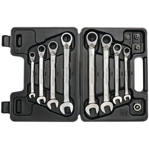 Inhoud: 8 x Ringratel-steeksleutel omkeerbaar, 8 10 12 13 15 17 18 19 mm Fijne vertanding, 72 tanden 15° schuine ratelkop Ideaal voor krappe ruimtes 1/2 + 3/8 + 1/4 ratelfunctie met adapter Vierkante adapter 1/4 x 10 mm 3/8 x 13 mm 3/8 x 13 mm