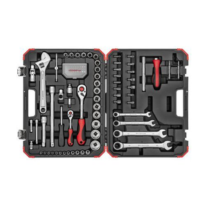 Kunststof koffer in GEDORE rood design Klembevestigde gereedschappen Metalen scharnieren / slot Inhoud: 1/4 "2K omschakelbare ratel met hendel 1/4" vierkante dopsleutel 1/4 "dopsleutelinzet, zeskant 1/4" T-handgreep met schuifstuk 1/4 "dopsleutelverlenging 1/4 "kruiskoppeling 1/2" dopsleutelverlenging 1/2 "kruiskoppeling uitbreidingsadapter / schuif 3/8" x 1/2 "1/4" bitadapter 1/2 "bitadapter 1/4" bits, binnenzeskant, sleuf, PH, PZ, TX, TX BO 5/16 "bits, binnenzeskant, sleuf, PH, PZ, TX Maximus schroevendraaier verstelbare moersleutel