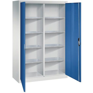 Stalen dubbele deurkast Serie 89,corpus van robuuste staalconstructie met hoogwaardige,gebakken coating voor hoge UV-bestendig,met kunststof glijdoppen als praktische kast- en vloerbescherming,hoge flexibiliteit van de binneninrichting hoogteverstelling in stappen van 15 mm,versterkte deuren voor hoge stabiliteit,deurophanging in draaibare bouten met hoek van ca.110 graden,scharnierend voor gezamenlijke vergrendeling,tussenschot binnen,8 legborden van staal met hoog draagvermogen van 70 kg,1 ergonomische trogbeugel Ergo-Lock 4.0 voor optimale bedieningsveiligheid en en slijtvast,3-bouts slot,met cilinderslot en 2 sleutels.