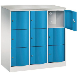 Garderobekast met 9 en 15 vakken vandalismebestendige deur, Type garderobekast: Met vakken, Materiaal: Staal, Aantal vakken/kolom: 3 (speciaal voor helmen), Aantal kastkolommen: 3, Onderstel: Op sokkel, Breedte kolom: 380 mm, Type sluiting: Met sleutel, Hoogte: 1255 mm, Breedte: 1150 mm, Diepte: 540 mm, Nuttige hoogte vak: 336 mm, Nuttige breedte vak: 320 mm, Nuttige diepte vak: 460 mm, Coating: Epoxy, Kleur ombouw: Lichtgrijs, Kleur deur: Blauw, RAL: 7035 5012, Geleverd gemonteerd: ja, Materiaal: Plaatstaal, Special Covid-19: nee