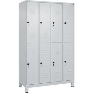 Garderobekast met 2 verdiepingen Classic PLUS op poten, 8 vaks, Type garderobekast: Standaard, Materiaal: Staal, Aantal vakken/kolom: 2, Aantal kastkolommen: 4, Onderstel: Op poten, Breedte kolom: 300 mm, Aantal kubusvakken: 8, Aantal deuren: 8, Type sluiting: Met hangslot, Hoogte: 1950 cm, Breedte: 1200 mm, Garderobe breedte: 1200 mm, Diepte: 500 cm, Nuttige hoogte vak: 1787 mm, Nuttige breedte vak: 298 mm, Nuttige diepte vak: 477 mm, Coating: Gelakt, Kleur ombouw: Lichtgrijs, Kleur deur: Lichtgrijs, RAL: 7035, Deur RAL: 7035, Configureerbaar: ja, Geleverd gemonteerd: ja, Etikethouder: ja, Montage: Zelfbouw, Nuttige hoogte: 1787 mm, Beluchting: ja, Garderobekast gebruiksomgeving: Collectieve kamer, Special Covid-19: nee, Gewicht: 64.9 g, Aantal vakken: 8, Hoogte voet: 100 mm
