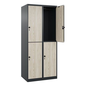 Garderobekast met 2 niveaus Evolo Plus, Type garderobekast: Standaard, Materiaal: Staal, Aantal vakken/kolom: 2, Aantal kastkolommen: 2, Onderstel: Op sokkel, Breedte kolom: 40 cm, Aantal kubusvakken: 4, Aantal deuren: 4, Type sluiting: Met hangslot, Hoogte: 185 cm, Breedte: 80 mm, Garderobe breedte: 80 cm, Diepte: 50 cm, Coating: Gelakt, Kleur ombouw: Donkergrijs, RAL: 7021, Configureerbaar: ja, Met schuine kappen: nee, Geleverd gemonteerd: ja, Beluchting: ja, Gewicht: 61.92 kg