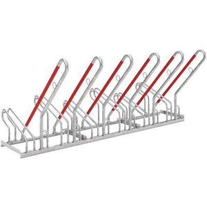 Modern fietsenrek. Robuust en stabiel. Corrosiebestendig door galvanisering. Ruimte tussen de wielen 350 cm. Geschikt voor mountainbikes met een wielbreedte van 55 mm. Let op: bevestigingsset en haken apart te bestellen.