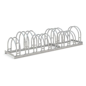 Robuust ontwerp van staal, beschermd tegen corrosie door boogvormige beschermbeugels. Biedt veel ruimte in een beperkte ruimte. Overal te gebruiken waar fietsen snel worden geparkeerd: voor winkels, kantoren, enz. De verankeringen in de vloer en de montagesteunen worden afzonderlijk verkocht.