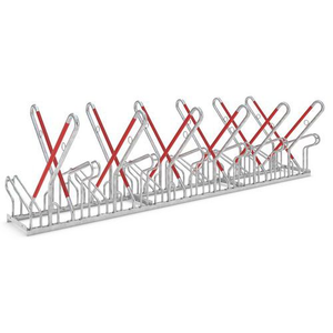 Enkel- of dubbelzijdig fietsenrek met robuuste constructie van stalen buizen en corrosiebescherming door galvanisatie. Neemt weinig ruimte in beslag dankzij de afwisselend geplaatste hoge en de lage beugels. Ruimte tussen de beugels voor fietsen met een bandenbreedte tot 55 mm. Ruimte tussen de wielen: 500 mm. Voorzien van een verbeterde diefstalbeveiliging doordat het frame kan worden vergrendeld op de geïntegreerde stalen beugel met oogje. Rode schokbescherming. Bij levering klaar voor uitbreiding in rijen en bevestiging op de ondergrond. Haakse steun voor bevestiging aan de ondergrond (set van 2) inbegrepen bij de levering.