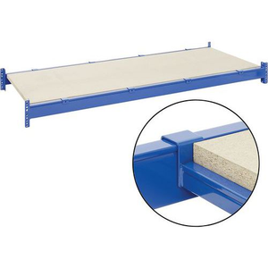 Houten niveaus op 3 steunprofielen. Hoog draagvermogen door het gebruik van steunprofielen. De legborden vormen 1 vlak met het rechthoekige profiel van de ligger. Steunprofielen met poedercoating RAL 5010 gentiaanblauw. Legbord van houtvezelplaat van 38 mm, kwaliteit V20 E1.
