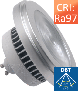 Megaman DBT led-lamp, wit, dimbaar, voet GU10, 11W, temperatuur 2800K, uitvoering glas/afdekking helder, weergave-index 90 - 100, lichtstroom 800lm, lampvorm reflector, lampaanduiding AR111, lichtkleur vlgs. EN 12464-1 warmwit < 3300 K, specifieke lichtstroom lamp 73lm/W,