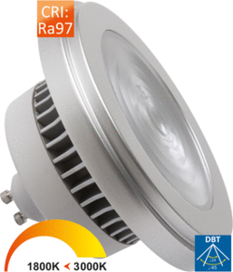 Megaman Dim to warm led-lamp, wit, dimbaar, voet GU10, 10W, temperatuur 1800 - 3000K, energie-efficiƫntieklasse volgens E G, uitvoering glas/afdekking helder, weergave-index 90 - 100, lichtstroom 750lm, lampvorm reflector, lampaanduiding AR111, lichtkleur vlgs. EN 12464-1 warmwit < 3300 K,