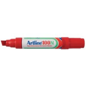 Artline permanent marker 100. Deze permanent marker is voorzien van een schuine punt en schrijft op alles, zoals karton, papier, hout, glas, metaal, enz. Tevens is deze milieuvriendelijk en zonder xykleen, dus tast de ozonlaag niet aan. De inkt droogt onmiddelijk en lekt niet en geeft geen vlekken. Punt: ultra, 7,5-12mm. Kleur: rood. Pak: 12 stuks.