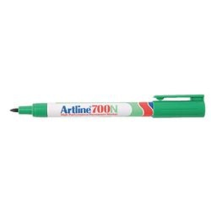 Artline permanent marker 700. Deze permanent marker is voorzien van een ronde punt en schrijft op alles, zoals karton, papier, hout, glas, metaal, enz. De marker schrijft als een gewone pen dankzij de medium punt. Tevens is deze milieuvriendelijk en zonder xykleen, dus tast de ozonlaag niet aan. De inkt droogt onmiddelijk en lekt niet en geeft geen vlekken. Punt: medium, 0,7mm. Kleur: groen. Pak: 12 stuks.