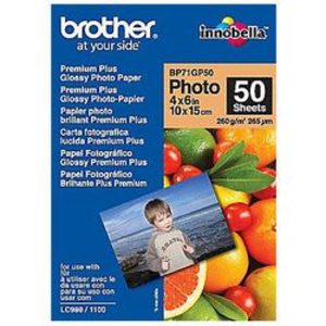 Brother Fotopapier BRBP71GP50. Basis productkleur: Wit. Breedte: 100 mm. Formaat: A6. Geschikte printers: Inkjet. Gewicht (g/m²): 260 g/m². Hoogte: 150 mm. Kleur: Wit. Merk: Brother. Model: BRBP71GP50. Oppervlak: Glanzend. Product Type: Fotopapier.