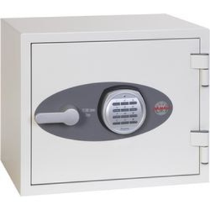 Phoenix elektrische kluis Titan FS1281E. Materiaal: gegalvaniseerd staal. Afmeting buitenzijde (bxdxh): 412 x 363 x 360 mm. Afmetingen binnenzijde (bxdxh): 230 x 234 x 260 mm. Capaciteit: 19 l. Brandvertragend: ja, 60 minuten voor papier. Afsluitbaar: ja Sluitmechanisme: elektronisch. Meegeleverd met product: vier interne sleutelhaken, en een uittreklade. Verzekeringsbedrag gedekt: € 2500. Kleur: wit.
