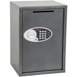 Phoenix afstortkluis Vela SS0804ED. Uitvoering: Met sleuf. Verzekeringsgedekt: € 1.500. Buitenafmetingen: 500 x 350 x 310 mm. Slot: elektronisch slot. Gewicht: 16 kg. Inhoud: 51 liter. Kleur: grijs.