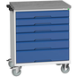 Verrijdbare gereedschapswagen Verso, Totale hoogte: 980 mm, Aantal laden: 6, Totale breedte: 800 mm, Totale diepte: 600 mm, Kleur: Blauw, Totale hoogte lade: 3 x 100 ; 2 x 125 ; 1 x 175 mm, Kleur ombouw: Lichtgrijs, Max. belasting per lade: 50 kg, Max. belasting: 300 kg, RAL: 5010, Zwenkwiel Ø: 125 mm, Special Covid-19: nee, Aantal legborden: 0, Aantal zwenkwielen: 4, Recyclebare verpakking: Ja - 100%, Gerecyclede verpakkingen: 93 %, Gewicht: 92.66 kg, Type nr.: 16927003.11, Lade kleur: Blauw