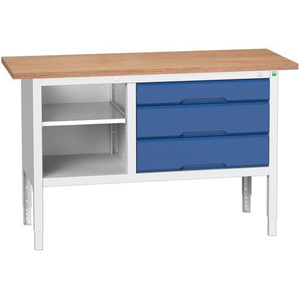 Werkbank monobloc Verso, Max. belasting: 800 kg, Totale hoogte: 930 mm, Totale breedte: 1500 mm, Werkbank blad materiaal: Beuk multiplex, Breedte: 1500 mm, Diepte: 600 mm, Totale diepte: 600 mm, Frame kleur: Lichtgrijs, Hoogte: 930 mm, Werkhoogte: 930 mm, Min. verstelbare hoogte: 830 mm, Max. verstelbare hoogte: 930 mm, Dikte tafelblad: 30 mm, Aantal laden: 3, Aantal legborden: 1, Hoogte lade: 1 x 125 ; 2 x 175 mm, Kleur: Blauw, Lade kleur: Blauw, RAL: 5010, Max. belasting lade: 75 kg, Special Covid-19: nee, Recyclebare verpakking: Ja - 100%, Gerecyclede verpakkingen: 93 %, Gewicht: 115.8 kg, Diepte tafelblad: 600 mm