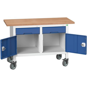 Verrijdbaar werkbank uit één stuk Verso 1250x600 M2, Totale hoogte: 830 mm, Aantal laden: 2, Totale breedte: 1250 mm, Totale diepte: 600 mm, Kleur: Blauw, Deurhoogte: 350 mm, Dikte tafelblad: 30 mm, Totale hoogte lade: 2 x 125 mm, Kleur ombouw: Lichtgrijs, Max. belasting per lade: 75 kg, Max. belasting: 300 kg, Aantal deuren: 2, RAL: 5010, Zwenkwiel Ø: 125 mm, Special Covid-19: nee, Aantal legborden: 0, Aantal zwenkwielen: 4, Recyclebare verpakking: Ja - 100%, Gerecyclede verpakkingen: 93 %, Werkbank blad materiaal: Beuk multiplex, Gewicht: 93.59 kg, Type nr.: 16923201.11, Lade kleur: Blauw, Kleur deur: Blauw