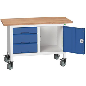 Verrijdbaar werkbank uit één stuk Verso 1250x600 M4, Totale hoogte: 830 mm, Aantal laden: 3, Totale breedte: 1250 mm, Totale diepte: 600 mm, Kleur: Blauw, Deurhoogte: 475 mm, Dikte tafelblad: 30 mm, Totale hoogte lade: 1 x 125 ; 2 x 175 mm, Kleur ombouw: Lichtgrijs, Max. belasting per lade: 75 kg, Max. belasting: 300 kg, Aantal deuren: 1, RAL: 5010, Zwenkwiel Ø: 125 mm, Special Covid-19: nee, Aantal legborden: 0, Aantal zwenkwielen: 4, Recyclebare verpakking: Ja - 100%, Gerecyclede verpakkingen: 93 %, Werkbank blad materiaal: Beuk multiplex, Gewicht: 100.42 kg, Type nr.: 16923203.11, Lade kleur: Blauw, Kleur deur: Blauw