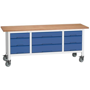 Verrijdbaar werkbank uit één stuk Verso 2000 x 600 M33, Totale hoogte: 830 mm, Aantal laden: 9, Totale breedte: 2000 mm, Totale diepte: 600 mm, Kleur: Blauw, Dikte tafelblad: 30 mm, Totale hoogte lade: 3 x 125 ; 6 x 175 mm, Kleur ombouw: Lichtgrijs, Max. belasting per lade: 75 kg, Max. belasting: 300 kg, RAL: 5010, Zwenkwiel Ø: 125 mm, Special Covid-19: nee, Aantal legborden: 0, Aantal zwenkwielen: 4, Recyclebare verpakking: Ja - 100%, Gerecyclede verpakkingen: 93 %, Werkbank blad materiaal: Beuk multiplex, Gewicht: 170.71 kg, Type nr.: 16923233.11, Lade kleur: Blauw