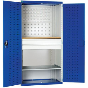 Werkblad van beukenmultiplex, dikte 25 mm Legborden van gegalvaniseerd staal verstelbaar in stappen van 25 mm Maximaal draagvermogen per legbord is 100 kg en 160 kg voor de breedte 1300mm Binnenladen gemonteerd op geleiders met lagers, draagvermogen 75 kg. Bekleding geperforeerde bodem of met bakken