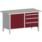 Werkbank linoleum Cubio, Totale hoogte: 840 mm, Totale breedte: 1500 mm, Werkbank blad materiaal: Linoleum, Breedte: 1500 mm, Diepte: 750 mm, Totale diepte: 750 mm, Frame kleur: Lichtgrijs, Hoogte: 840 mm, Werkhoogte: 840 mm, Dikte tafelblad: 40 mm, Aantal laden: 3, Aantal legborden: 0, Hoogte lade: 2 x 150 ; 1 x 200 mm, Aantal deuren: 1, Kleur: Rood, Kleur deur: Rood, Lade kleur: Rood, RAL: 3004, Max. belasting lade: 75 kg, Special Covid-19: nee, Recyclebare verpakking: Ja - 100%, Gerecyclede verpakkingen: 93 %, Gewicht: 109.55 kg, Diepte tafelblad: 750 mm
