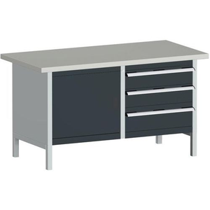 Werkbank linoleum Cubio, Totale hoogte: 840 mm, Totale breedte: 1500 mm, Werkbank blad materiaal: Linoleum, Breedte: 1500 mm, Diepte: 750 mm, Totale diepte: 750 mm, Frame kleur: Lichtgrijs, Hoogte: 840 mm, Werkhoogte: 840 mm, Dikte tafelblad: 40 mm, Aantal laden: 3, Aantal legborden: 0, Hoogte lade: 2 x 150 ; 1 x 200 mm, Aantal deuren: 1, Kleur: Antraciet, Kleur deur: Antraciet, Lade kleur: Antraciet, RAL: 7016, Max. belasting lade: 75 kg, Special Covid-19: nee, Recyclebare verpakking: Ja - 100%, Gerecyclede verpakkingen: 93 %, Gewicht: 109.55 kg, Diepte tafelblad: 750 mm