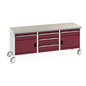 Verrijdbaar werkplaatsbank monobloc Cubio, Totale hoogte: 840 mm, Aantal laden: 5, Totale breedte: 2000 mm, Totale diepte: 750 mm, Kleur: Rood, Deurhoogte: 350 mm, Dikte tafelblad: 40 mm, Totale hoogte lade: 4 x 150 ; 1 x 200 mm, Kleur ombouw: Lichtgrijs, Max. belasting per lade: 75 kg, Max. belasting: 300 kg, Aantal deuren: 2, RAL: 3004, Zwenkwiel Ø: 125 mm, Special Covid-19: nee, Aantal legborden: 0, Aantal zwenkwielen: 4, Recyclebare verpakking: Ja - 100%, Gerecyclede verpakkingen: 93 %, Werkbank blad materiaal: Linoleum, Gewicht: 157.44 kg, Type nr.: 41002135.24V, Lade kleur: Rood, Kleur deur: Rood