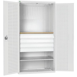 Werkplaatskast voor het overzichtelijk opbergen van uw gereedschap. Voorzien van perfogaten en sleufpanelen. Verstel eenvoudig per 25 mm de hoogte van de legborden en laden. Sluit de deuren veilig af met de driepuntssluiting en het cilinderslot.
